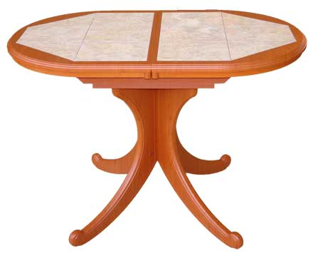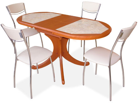 Стол «Шарди О».Цена 13 350 руб. Размер столешницы, мм: 700×1140(1510).Материал: Керамическая плитка термостойкая + пленка РVС.Цвета столешницы: бук, вишня, орех, махагон, венге, серый.Цвет на фото: вишня.4 варианта плитки. Плитка на фото: 98.Стул «Омега 4».Цена 2 690 руб.Материал: хром, на сиденье — кож. зам. или ткань (цвет на выбор).Варианты спинки: мягкий (кож. зам.), твердый (МДФ + пленка PVC).Обивка сиденья на фото: кож. зам. светлый.Спинка на фото: кож. зам. светлый.